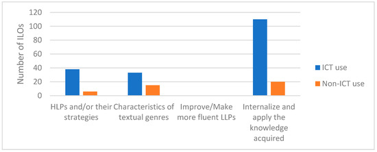 In total, 222 ILOs were identified, which were divided into four general categories due to their general focus (see Section 2.2.1). As Figure 2 shows, the category with the highest number of ILOs was related to the internalization/application of knowledge (n = 130; 58.5%), of which 110 involved the use of ICTs for its achievement. In contrast, the category of ILOs focused on the acquisition of knowledge of low-level cognitive processes (e.g., grammar and spelling) did not appear in any of the studies, since these types of processes were worked on through practice, i.e., through the category of ILOs related to internalization and application. The categories referring to the acquisition of knowledge about high-level cognitive processes (n = 44; 19.9%) and the characteristics of textual genres (n = 48; 21.6%) presented a similar number of ILOs. On the one hand, of the 44 ILOs focused on high-level cognitive processes, 38 required the use of ICT for their realization. On the other hand, only 15 of the 48 ILOs related to the acquisition of knowledge about the characteristics of textual genres required the use of ICT for their achievement.