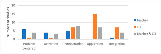 The problem-centered and integration principles appear with a similar frequency (Figure 3), with only one study showing a difference between them. On the one hand, the problem-centered principle related to showing the intervention objectives to the students appears in 11 studies. Specifically, in six studies it is developed only by the teacher, in one only by the ICT, and in four by the teacher and the ICT jointly (e.g., the teacher explains the learning objectives verbally in class, but also sends an email explaining them). On the other hand, the principle of integration whereby students are given the opportunity to show their work publicly appears in 12 studies. In this case, there is only one study in which the principle is developed only by the teacher, while the rest involve the ICT, either jointly with the teacher (n = 4) or independently (n = 7).