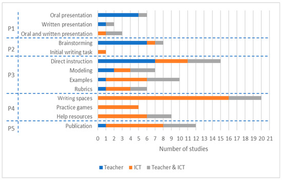 Of the two activities mentioned, brainstorming was the most frequent, appearing in 8 of the 22 studies. It is noteworthy that this activity in almost all cases was performed without ICT use (n = 6). However, the activity related to the performance of previous writing tasks only appeared in one study [51] in which ICTs were used for its performance.