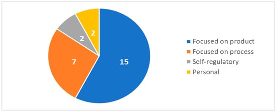 In the present study, six feedback categories were analyzed based on previous taxonomies. First, four types of feedback were analyzed according to the levels [31]. Figure 5 shows that of these types of feedback, the one that appears most frequently is the one focused on the textual product (n = 15). Moreover, in 11 of these studies the feedback is provided by the teacher and the ICT jointly (e.g., students write a text in a digital platform and receive automatic feedback provided by the ICT, but also comments from the teacher) and in four it is provided only by the ICT. The other type of feedback that appears most frequently among the studies was the one focused on process (n = 7), which was carried out in six studies through the teacher and the ICT and in one case through the ICT only.