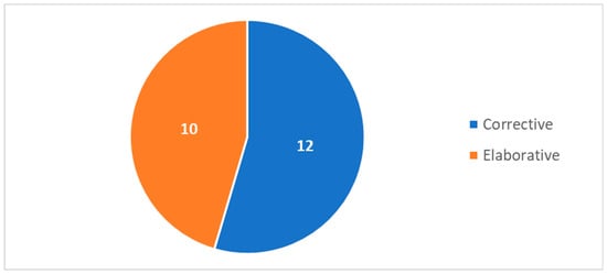 Second, the types of feedback provided were analyzed, distinguishing six categories based on previous taxonomies [31,32]. On the one hand, four types of feedback were identified according to level: (a) task feedback, which consists of providing feedback on the final execution of the task; (b) process feedback, i.e., providing feedback on the steps to be followed to perform the final product; (c) self-regulatory feedback, which refers to student’s self-assessment skills, providing messages through which the student can self-assess what he or she has learned; and (d) personal feedback, which focuses more on encouraging the student than on the content, using messages addressed to the “self” (e.g., you are a great student). On the other hand, a distinction was made between two types of feedback depending on the level of information. The first is corrective feedback, focused on showing the student whether the answer is correct or incorrect without giving more information. The second type of feedback analyzed is elaborative, in which, in addition to indicating the mistakes or correct answers, an explanation is given as to why it is a mistake or a correct answer, i.e., this kind of feedback provides a deeper understanding of the task [33,34].