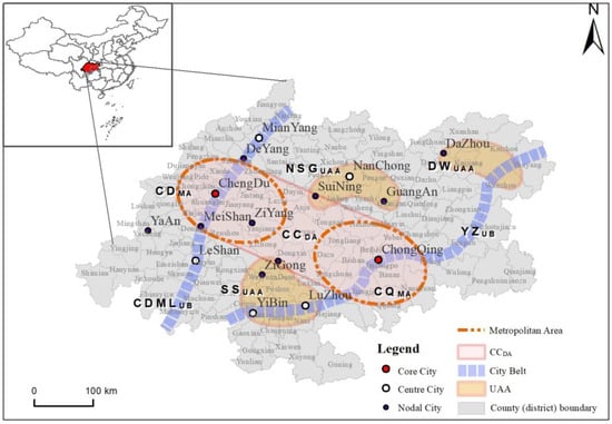 The Chengdu–Chongqing urban agglomeration (CCUA) is a key development area in central and western China. It is one of the five national urban agglomerations in China and plays a pivotal role in the economic development of the central region and the entire country. Additionally, it serves as an important platform for the development of the western part of the country, provides strategic support for the Yangtze River Economic Belt, and serves as a significant demonstration area for promoting new types of urbanization in China. According to the CCUA Development Plan approved by the State Council, the specific scope of the area includes 27 districts (counties) in Chongqing, including Yuzhong, Wanzhou, Qianjiang, Fuling, Dadukou, Jiangbei, Shapingba, Jiulongpo, Nan’an, and Beiqiang, as well as part of Kaizhou and Yunyang; and Zigong, Luzhou, Deyang, Mianyang (in addition to Beichuan and Pingwu counties), Suining, Dazhou (in addition to Wanyuan), Ya’an (in addition to Tianquan and Baoxing counties), and Chengdu, Zigong, Luzhou, Deyang, and Mianyang in Chengdu (in addition to Beichuan and Pingwu counties). According to the plan, the CCUA will build a “one axis, two belts, two cores, three districts” spatial development pattern (Figure 1). One axis refers to the Chengdu–Chongqing Development Axis (CCDA). The two belts include the Urban Belt along the Yangtze River (YZUB) and the Chengdu–Deyang–Mianyang–Leshan Urban Belt (CDMLUB). The two cores refer to the two core cities (Chengdu and Chongqing). Three districts include the Southern Sichuan Urban Agglomeration Area (SSUAA), Nanchong–Suining–Guang’an Urban Agglomeration Area (NSGUAA), and the Dazhou–Wanzhou Urban Agglomeration Area (DWUAA). There are also two other metropolitan areas involved around the core city, the Chengdu metropolitan area (CDMA) and the Chongqing metropolitan area (CQMA).