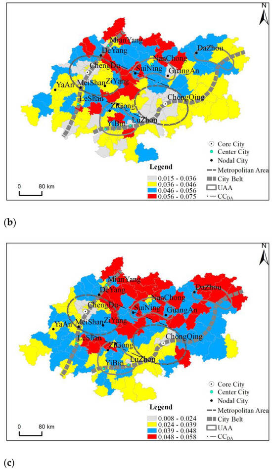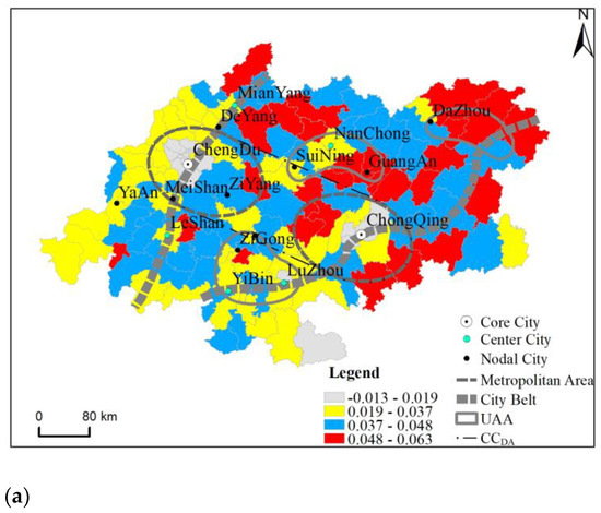 The range of the aging speed is selected as the range of intervals with the largest and smallest values of aging speed in the districts and counties of the CCUA. The low, medium, and high categories of the aging speed thresholds are utilized by the natural breakpoint method in the GIS software 10.2. Between 2000 and 2010, the range of the population aging speed in the CCUA was [−1.3%~6.3%], with an average growth rate of 3.7%, of which the maximum value of 6.3% appeared in Yuechi County of Guang’an City and Yanyang County of Chongqing Municipality, and the minimum value of −1.3% appeared in the Pidu District of Chengdu Municipality. The spatial variation in the aging growth rate shows that the trends in the northeast and central and the south of the eastern area are greater than those in the northwest and southwest. The variability in speed directly affects the spatial variability of the aging level. Chongqing Municipality, Leshan City, Meishan City, and Mianyang City have the most districts (counties) in which the aging speed greater is than 3.8%; Chongqing Municipality has as many as eighteen districts (counties), in Leshan City, there are eight, and in Chengdu Municipality, there is only one. Overall, the high-speed areas are distributed in the peripheral areas of the two major cores and axes of the urban agglomeration. The Chengde–Mianle city belt is a north–south low-speed zone. The aging speeds in the dense urban area of South Sichuan and the dense urban area of South Suiguang are also lower than those of other surrounding areas. The Pidu District, Yuzhong District, and Jinjiang District have even become negative growth areas. It can be seen that the main development axes and dense urban areas in the CCUA development plan have an impact on the regional aging speed (Figure 5a).