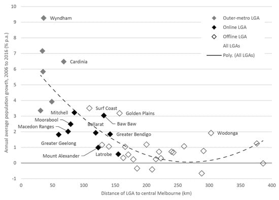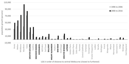 Figure 4 graphs annual average population growth in selected LGAs in the decade after RFR was commissioned in 2005–2006. It includes metropolitan LGAs connected to the suburban rail network yet traversed by RFR corridors. LGAs are organized by distance from central Melbourne to capture the potential influence of enhanced connectivity on population growth. The results show that metropolitan LGAs designated as growth areas, including Hume, Melton, Whittlesea, Wyndham, and Casey, are the principal absorbers of population and that regional LGAs lag comparatively behind. However, rates of population growth in LGAs connected to the RFR network mostly within 150 km or 90 min travel time by train outperform LGAs not connected to the network. Online cities within 150 km of central Melbourne experienced average annual population growth rates between 2% and 3% p.a., well above Victorian Government [20] forecasts, while offline cities beyond 150 km exhibited growth rates of between 0% and 1% p.a. Growth rates hollow out around Shepparton and Wangaratta, located between 150 km and 250 km from central Melbourne, and recover around Wodonga, which, combined with its twin-city Albury in New South Wales, has a larger population size and stronger economy.