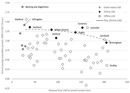 Figure 6 profiles average annual population growth for LADs along the WCML and southeastern line between 2005 and 2017. The results show that online LADs mostly outperformed offline LADs after HSR was introduced, achieving population growth rates between 1.75% and 2.25% p.a. Most offline LADs have a growth ceiling of 1.5% p.a. and a trend line of growth that approximates 1%. There are some exceptions, but the general pattern seems clear. One outlier in the results is Leicester, which is not connected to the two HSR corridors analysed in this study but occupies a node in the national transport network where major north–south and east–west corridors intersect. Improvements to transport connectivity have clearly influenced the growth prospects of online LADs compared to their offline counterparts. In addition, online LADs between 50 km and 150 km of central London compete quite strongly for population growth against outer metropolitan LADs.