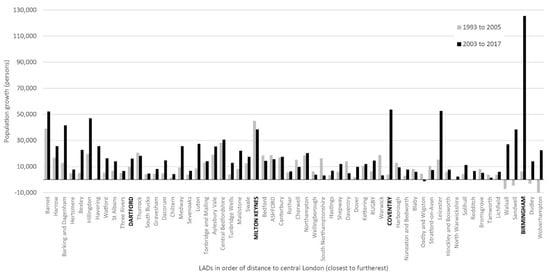 Urban growth in both regions exhibits strong core–periphery tendencies. Greater London’s population grew by approximately 14% between 2005 and 2017, twice the national average of approximately 7% [86]. Around that same time, Greater Melbourne’s population grew by approximately 33% between 2006 and 2016, approximately twice the Australian national average of 17% (derived from [85,101]). Finally, although London’s present-day population is much larger than Melbourne’s, the latter city is projected to double in size by 2066, to between 8.6 million and 12.2 million ([13], low and high projections). To put this in context, Greater London grew by only 1.57 million or 23.7% between 1981 and 2011 and, in that same time, Milton Keynes doubled in size from 122,016 to 248,821 (derived from [102,103]). These core–periphery dynamics are pertinent to this study because Milton Keynes was similar in size in 1981 to present-day Ballarat and Bendigo, which HSR could bring to within 45 min travel time of central Melbourne.