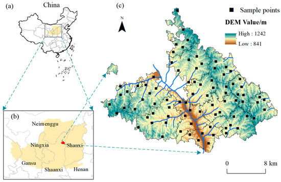 Overview of the study area and selection of sample villages. (Note: (a) the location of the Loess Plateau; (b) the location of Mizhi County on the Loess Plateau; (c) the spatial distribution of the sample points).