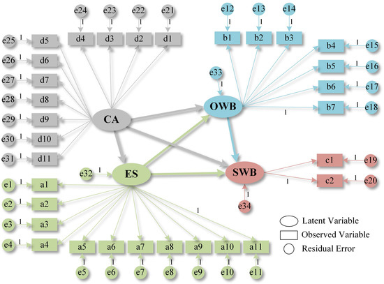 where Χ and Y are exogenous explicit variables and endogenous explicit variables, respectively; Λx is the factor loading of variable Χ on ω and Λy is the factor loading of variable Y on η; and δ and ε are the errors of variables Χ and Y, respectively. η is the endogenous latent variable, ω is the exogenous latent variable, α is the structural coefficient matrix of the endogenous latent variable, β is the structural coefficient matrix of the exogenous latent variable and the endogenous latent variable, and γ is the residual of the structural equation. The initial model was established based on the research hypotheses (Figure 3). Farmers’ capabilities were taken as the exogenous latent variable. The ESs, objective well-being, and subjective well-being were the endogenous latent variables, and the observed variables were used as the latent variables to construct a structural equation model containing 4 latent variables and 31 observed variables.