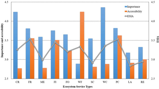 The importance, accessibility, and ESIA index values of ESs among farmers. Note: CR, crops; FR, fruits; ME, meats; FI, fuelwood; FO, fodder; WF, wild food; SC, soil conservation; WC, water conservation; PC, pest control; LA, landscape aesthetics; and RE, recreation.