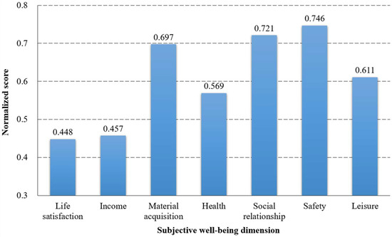The results regarding the farmers’ perceived subjective well-being are shown in Figure 5. The farmers’ life satisfaction scores ranged from 11 to 31 with a mean value of 19.96, which is slightly lower than the level of life satisfaction of Chinese residents reported 10 years ago (mean value = 20.32). This indicates that the life satisfaction of farmers in Mizhi County is still low. The results of the satisfaction perception analysis for the MA dimensions varied greatly. The farmers were more satisfied with their security, social relationships, and access to material resources. Among these factors, the farmers were most satisfied with security, but 8.11% of the respondents still reported uneasiness due to threats to their personal safety or uncertainty over property security and were most dissatisfied with their security status. This was followed by social relations, with 8.82% of the respondents reporting that they considered their neighborhood or family relations to be poor and that their social relations were the least satisfactory. The level of satisfaction associated with material access was high, but 5.71% of the respondents still showed the most dissatisfactory attitude toward their material access. The farmers were less satisfied with the income, health, and leisure dimensions. The farmers had high expectations of adequate income acquisition, but due to their own capabilities and external objective conditions such as market fluctuations and natural environmental disturbances, adequate income acquisition remains difficult, resulting in income satisfaction being the lowest. The lower health satisfaction is related to the onerous nature of agriculture and the aging of the sample population. The mean leisure satisfaction among the farmers was 3.44, and 35.19% of the respondents reported having the highest leisure satisfaction in the survey. Overall, the results regarding the farmers’ perceptions of the six categories of subjective well-being indicators varied widely, with farmers being less satisfied with things that are difficult to obtain in real life, for example, indicators such as income and health, while farmers were overall more satisfied with things that are easier to access, for example, indicators such as safety and social relationships.