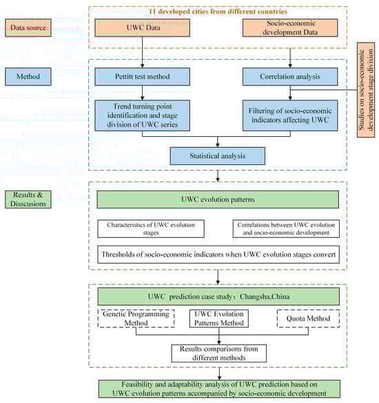 Schematic diagram of the research on patterns in the evolution of UWC accompanying socio-economic development and their application to prediction.