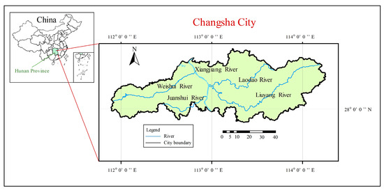 In the present study, Changsha (Figure 2), located in the northeast region of Hunan Province, China, was used as the research case study to demonstrate the predictive value of the universal patterns in the evolution of UWC accompanying socio-economic development, as derived using the approaches in Section 2.1.2. The city of Changsha has a total area of 11,819 km2, and the multi-year average precipitation is 1428 mm. Historical data from Changsha pertaining to UWC and socio-economy were obtained from local water department websites, water resources bulletins, and statistical yearbooks.