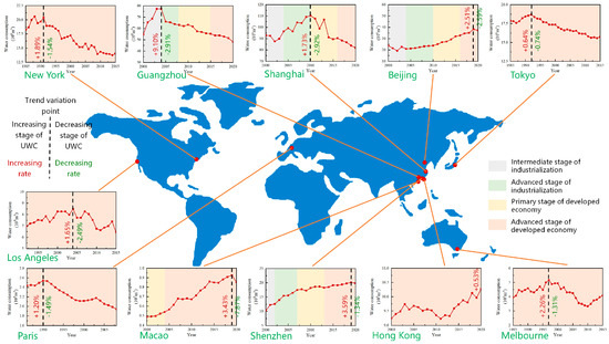 The general correlation between UWC and socio-economic development can be determined by referring to the historical evolution of UWC accompanying the stages of socio-economic development in the developed cities (Table 1). Annual UWC series data of the developed cities selected in Section 2.1.1 were used to clarify the temporal variation in UWC. Figure 3 plots the annual UWC series of different developed cities, spanning from 1985 to 2020. The stages of socio-economic development accompanying the evolution of UWC in each city were determined according to the threshold values of the characteristic factors for different stages of socio-economic development, as indicated in Table 1. These stages are marked as color backgrounds in each sub-figure in Figure 3. The turning point for the UWC time-series of each city was identified using the Pettitt test method introduced in Section 2.1.2, and the corresponding results are presented in Figure 3 using the dashed line in each sub-figure. The average annual rates of change in UWC before and behind the turning point in each city were compared to observe the common evolution of UWC characteristics.