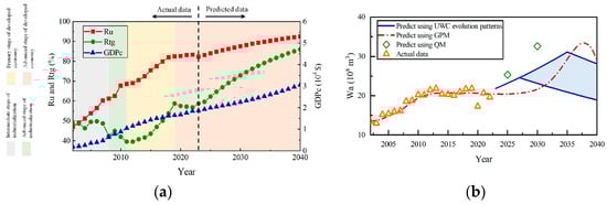 As shown in Figure 5a, the Ru, Rtg, and GDPc of Changsha in 2027 were predicted to be 85.52%, 66.90%, and USD 20,911, respectively, exceeding the lower socio-economic indicator threshold values derived in Section 3.2 (85%, 60%, and USD 10,000), respectively. In 2035, Rtg of Changsha were predicted to 80.48%, exceeding the upper Rtg threshold derived in Section 3.2 (80%). Accordingly, Changsha’s UWC was predicted to start declining or stabilizing in one of the years between 2027 and 2035.