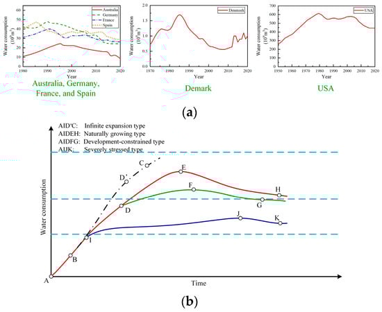 The evolution of water consumption on the city scale can be compared with that on the state or regional scale. The evolution of water consumption in different states or regions is plotted in Figure 6a, for which the data source is AQUASTAT, a product of the Food and Agriculture Organization (FAO). As shown in Figure 6a, the state or regional water consumption increased in the initial period but decreased or stabilized after reaching its peak value, which was similar to the general patterns in the evolution of UWC on the city scale derived in Section 3.1. By analyzing the driving mechanisms of state or regional water consumption, Zhao et al. [24] highlighted that the state or regional evolution of water consumption typically follows an AIR curve, as indicated in Figure 6b. Depending on the availability of water resources, the AIR curve can be divided into three types: naturally growing, development-constrained, and severely stressed. It can be inferred from the comparisons between the evolutions of UWC in different cities (Figure 3) and the AIR curve layout (Figure 6b) that the evolution of water consumption in a city may resemble an AIR curve. For instance, given the relatively abundant water resources in Guangzhou, the evolution of UWC may resemble the natural-growth type of AIR curve, in which water consumption increases and decreases rapidly before and after it reaches the peak value, respectively. In contrast, the increase and decrease rates of Tokyo are considerably lower, consistent with the development-constrained type or severely stressed type of AIR curve.