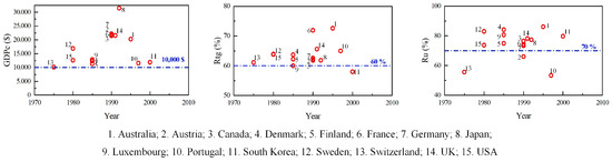 Moreover, to compare the correlations between the patterns in the evolution of water consumption on the city scale and those on the state or regional scale, data on the GDPc, Rtg, and Ru (derived from the works of Zhao et al. [24]) of several states and regions when the corresponding UWC began to decrease or stabilize (derived from World Bank Open Data) are presented in Figure 7. The relationships between the evolution of water consumption and the socio-economic development characteristics of a city, as derived in Section 3.2, were similar to those in a state or region, as shown in Figure 7. However, certain differences exist. Zhao et al. [24] summarized the relationships between the evolution of water consumption and socio-economic development in a developed country or region and indicated that when water consumption of a country or region reaches its peak value, the GDPc, Rtg, and Ru of the developed state or region generally exceed USD 10,000, 60%, and 70%, respectively. A comparison of Figure 4 and Figure 7 indicates that the distributions of GDPc and Rtg of cities when the corresponding UWC started to decrease or stabilize are more discrete than those of states and regions. However, the distribution of the Ru of states and regions when the corresponding UWC started to decrease or stabilize is more discrete than those of cities. The standard deviations of GDPc, Rtg, and Ru of the cities are USD 32,888.68, 14.41%, and 6.23% respectively, but those of states and regions are USD 4878.49, 4.06%, and 9.85%, respectively. This discrepancy may be attributable to the fact that the socio-economic development patterns of cities are more varied than those of states or regions.