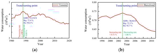 The reliability of the proposed approach for studying patterns in the evolution of UWC accompanying socio-economic development may be evaluated through comparisons between the patterns in the evolution of UWC accompanying socio-economic development derived in Section 3.1 and Section 3.2 with the evolution of UWC in cities that were not included in among the research cities in the present study. For instance, the evolution of UWC in Toronto and Barcelona with socio-economic indicator values corresponding to the turning point is shown in Figure 8. The sources of the data shown in Figure 8a and Figure 8b, respectively, were a. the Chief Financial Officer and Treasurer and General Manager, Toronto Water, and Statistics Canada and b. the data sets constructed by Rasilla et al. [47] and Idescat. Statistical Institute of Catalonia (IDESCAT).