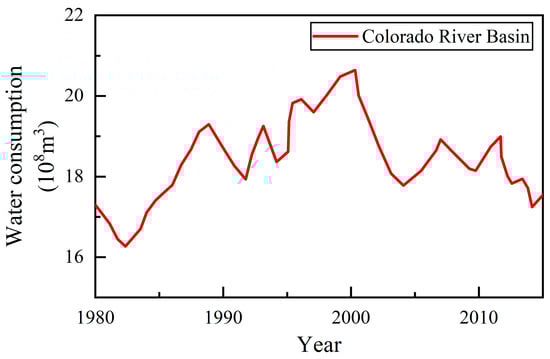 Moreover, the proposed approach to studying patterns in the evolution of UWC accompanying socio-economic development on the city scale may be generalized for application to studying such patterns on other scales, like city groups, river basins, etc. For instance, as indicated in Figure 9, the annual water consumption in the Colorado River Basin showed an increasing trend before reaching the peak value and then changed to a decreasing trend, a pattern similar to the patterns in UWC on the city scale, as derived in Section 3.1. Therefore, the turning point in the annual water-consumption series on another scale may be also identified through the Pettitt test method, as illustrated in Section 2.1.1. The main socio-economic indicators impacting the evolution of water consumption may be similarly identified through the correlation analysis based on the PCC. Then, the lower and upper threshold values of the socio-economic indicators driving trends in UWC on this scale may be also derived through the statistical analysis method, as illustrated in Section 3.2. Through these generalized applications, novel findings on the patterns of water consumption on other scales, like city groups and river basins, may be attained.