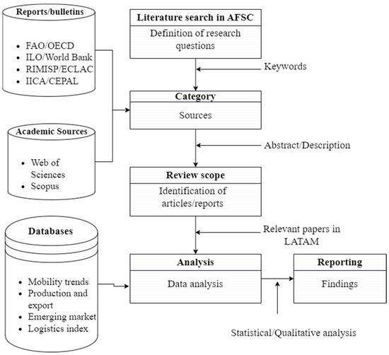 Considering the proposals of Al Naimi et al. [2], Chandra and Grabis [9], and Rowley and Slack [52], Figure 1 shows the scheme of the methodology used for this research. It was carried out using a descriptive approach through a systematic collection of databases and a review of reports and technical bulletins on the behavior of COVID-19 in LATAM carried out and published by FAO, OECD, ILO, World Bank, RIMISP, ECLAC, and IICA.