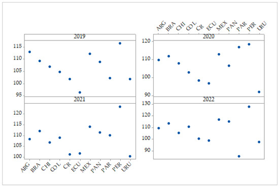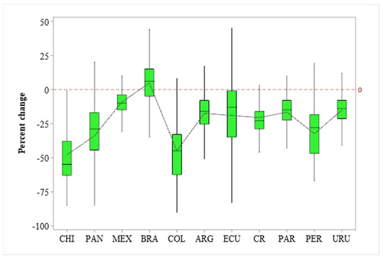 According to data from Google [74], during 2020, the mobility trends in places such as supermarkets, food stores, agricultural product markets, pharmacies, and specialized food stores were drastically reduced (Figure 2), reaching a percentage average change below −50% in Chile (CHI); in Panama (PAN), Colombia (COL), and Peru (PER), it was between −40% and −30%; in countries such as Mexico (MEX), Argentina (ARG), Ecuador (ECU), Costa Rica (CR), Paraguay (PAR), and Uruguay (URU), the mobility trend was on average between −10% and −25%; finally, and contrary to the other LATAM countries, Brazil (BRA) presented a positive average mobility trend close to 10%.