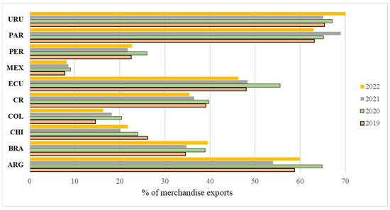 According to the FAO [44], agrifood exports reported by different countries in LATAM increased by an average of 2.7% in 2020 compared to 2019 (Figure 4), while total merchandise exports registered a 9.1% drop.