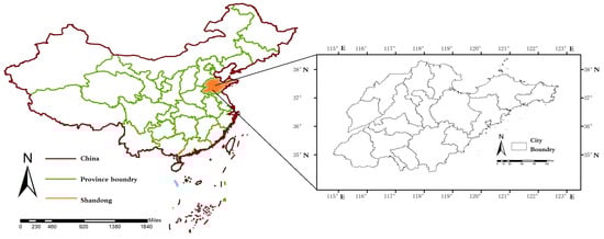 Shandong Province (34°22.9′–38°24.01′ N, 11°7.5′–122°42.3′ E) is an important province on the eastern coast of China. Shandong is surrounded by the Yellow Sea and Bohai Sea to the east and north. Shandong is connected with Anhui Province, Jiangsu Province, Henan Province, and Hebei Province. According to the Third Land Use Survey of Shandong Province, the province’s land area is 155,800 square kilometers, accounting for 1.54% of the country’s total area. The plains are the main geomorphologic feature within Shandong Province, and their area accounts for about 67% of the total area of Shandong Province. The northwestern, western, and southwestern regions of Shandong Province all belong to the North China Plain. The landforms can be roughly divided into three parts: the mountainous and hilly area of central and southern Shandong, the lower mountainous and hilly area of eastern Shandong, and the plain area of northwestern Shandong. In general, the topography of Shandong Province is characterized as “high in the middle and low in the surroundings” [28]. The center of Shandong Province is the mountainous region dominated by the Taishan Mountain Range, and the highest point in Shandong is Yuhuangding, the highest peak in the Taishan Mountain region, with a height of 1545 m. To the east of Shandong Province are the hills of the Shandong Peninsula, which extend into the sea (Figure 1).