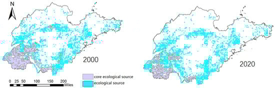 - From 2000 to 2020, the fragmentation of cultivated land in Shandong Province is obvious. The area of the ecological source area decreased by nearly 7000 km2. The capacity to provide ecosystem services needs to be further improved. In particular, the protection of the large patches of cultivated land in southwestern Shandong should be strengthened.