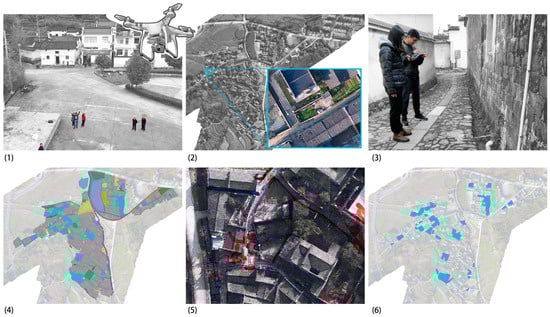 The identification and mapping of the space elements involved six activities (Figure 3). The process of drawing space elements diagrams was as follows: (1) we scanned the village by drone; (2) generated the aerial map; (3) marked the boundary of space elements on the map; (4) transformed the boundary into a CAD file; (5) went back to the site and supplemented lacked information; and (6) exported the space element diagrams into categories.