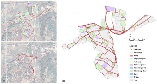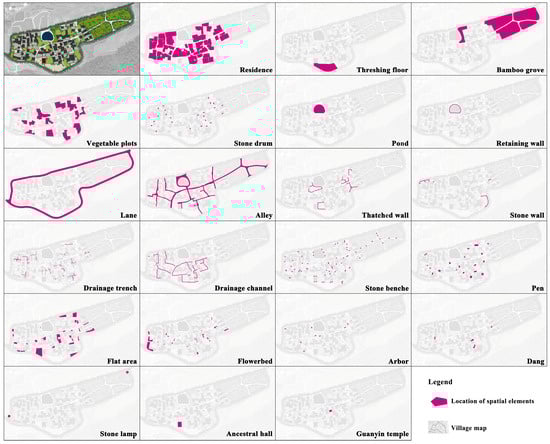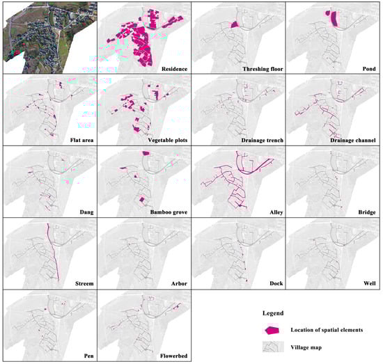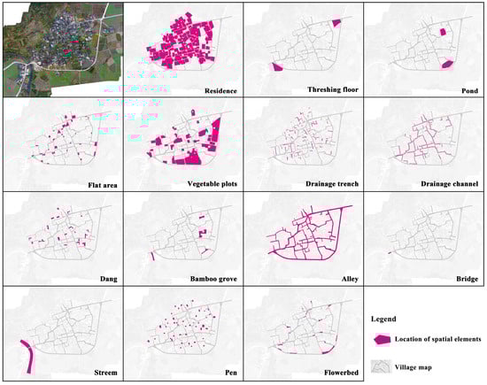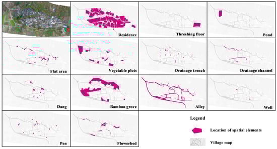 Unlike newly built rural community construction, which involves sorting out the classification of space elements according to planning drawings, the construction of ancient villages is bottom–up, as they are spontaneous evolutions of their inhabitants’ generations. Thus, the classification of space elements requires on-site exploration. Based on this logic, our classification involved a three-step process.
