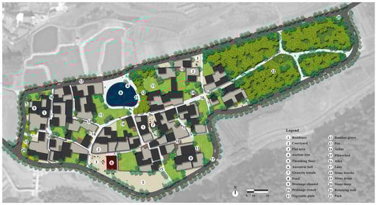 The external space of ancient villages, as defined in this research, is the space constituting areas between residential buildings. A village’s external space is not extended to the infinite extension of nature, such as forests and farmland. It is a domain of a meaningful social space rather than a natural environment beyond daily social interactions [33]. This external space constitutes the core of rural land use design, which involves various types of spaces and structures within the boundaries of a village’s socially constructed spatial entity.