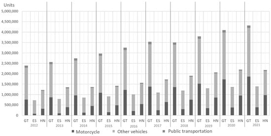 A decade of evolution in transportation modes in the NCAT. Source: Own elaboration based on [12,13,14]. Note: GT = Guatemala; ES = El Salvador; HN = Honduras.
