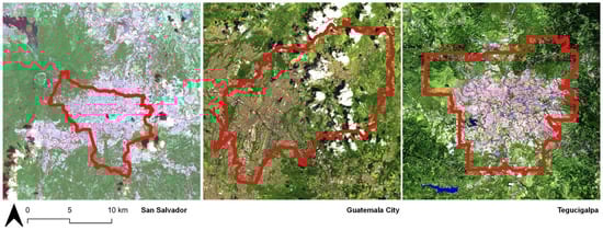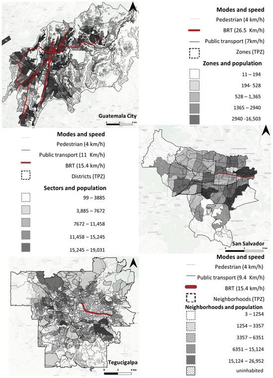 The selection of the study cases involving the three capital cities from the Northern Central American Triangle region was based on the significant number of commonalities between them. These include the implementation of BRT systems for mass transport, their significant urban growth between 1990 and 2014, and the fact that they are conurbations and that have similar percentages of population in relation to the country as a whole (around 30%), among other aspects highlighted by Maria et al. [30], suggesting a certain degree of homogeneity among the selected cities.
