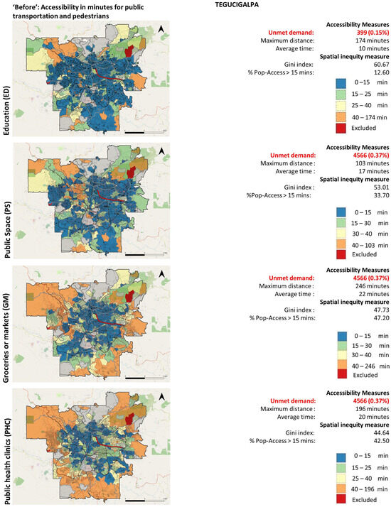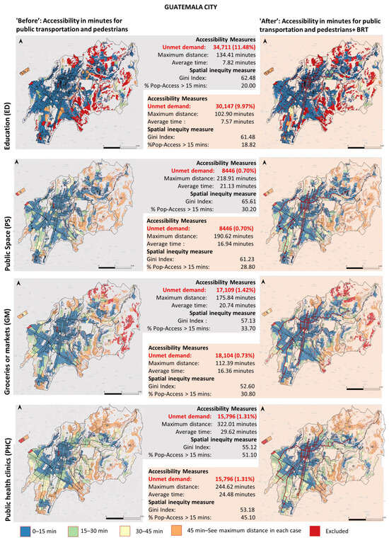 In Guatemala, the population has improved the travel times to all urban facilities, particularly public health clinics. Approximately 6% of the capital’s population, around 72,700 people, are estimated to be within a 15 min radius of a public health clinic. It is noteworthy that the Gini Index, as an indicator of equity, shows reductions in the access gaps to all urban facilities, especially market facilities, of up to 5 points. These improvements can be perceived via their respective variations in each TPZ, impacting the overall promotion of social sustainability, facilitating the creation of sustainable communities, and improving quality of life.