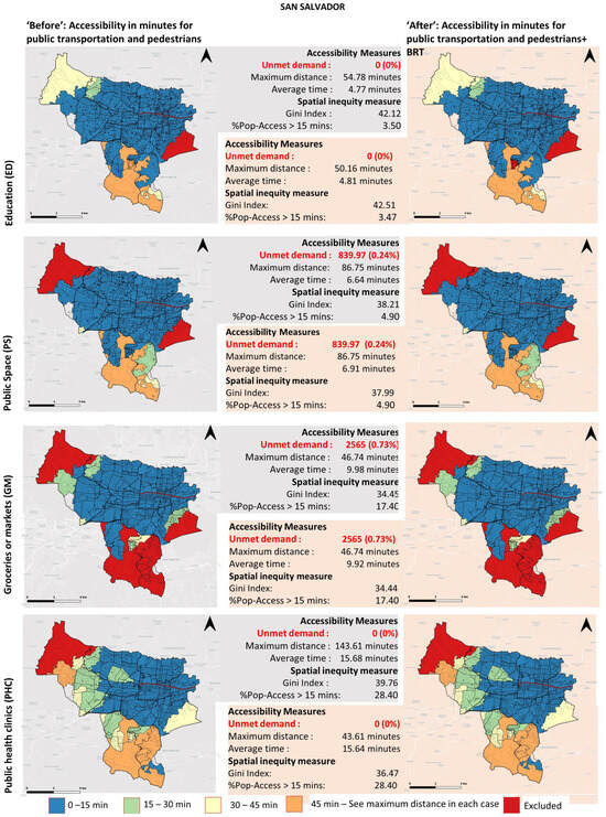 Figure 5, Figure 6 and Figure 7 present a visual summary of the results obtained from the accessibility evaluation. Each map displays the locations of urban facilities, using black dots as symbols. The figures demonstrate the evaluations conducted before and after the implementation of the BRT project, except for Tegucigalpa. Despite the construction of a significant part of the infrastructure, the BRT system never operated in Tegucigalpa.