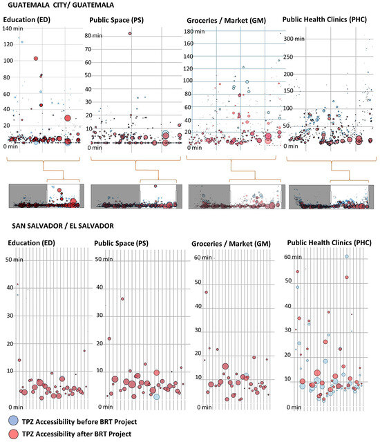 Figure 8 illustrates the third result for Guatemala and San Salvador regarding the accessibility before (indicated by blue dots) and after (indicated by red dots) the implementation of the BRT projects. The dot size indicates the population, revealing a significant reduction in travel time to public health clinics that serve a large number of people in Guatemala. In contrast, San Salvador shows only slight decreases in access times.