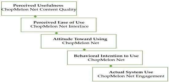 Schematic diagram of the customized technology acceptance model (TAM) applied to the ChopMelon Net.