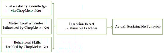 Figure 5 illustrates how the knowledge of sustainability gained through ChopMelon Net, together with the motivations and attitudes influenced by it, and the behavioral skills enhanced through the platform, combine to form a behavioral intention to adopt sustainability practices, which ultimately leads to actual sustainability behaviors. An innovative approach to ESD is proposed by incorporating real social issues into the learning process. The research needs to explore how ChopMelon Net influences learners’ knowledge acquisition, skills development, and values formation.