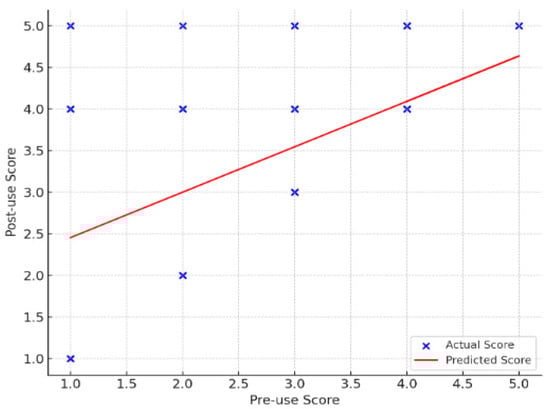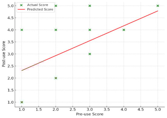 Regression analysis of problem-solving skills. Regression coefficient (slope): 0.619, intercept: 1.692, R2 (degree of explanation): 0.348. The model explained 34.8% of the variance, indicating that pre-use problem-solving ability was a better predictor of post-use ability.