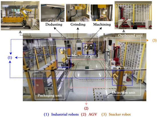 This study concentrates on two models of industrial robots: the M-20iA/35M and the M-10iD/12. Figure 3 provides images of these industrial robots. These robots feature advanced servo control technology, ensuring seamless integration and high-speed operation stability. The M-20iA/35M model’s expansive reach radius of 1813 mm is particularly suited for outbound and packaging units, where an extended reach is essential for practical grasping tasks. On the other hand, the M-10iD/12 model is deployed within the machining unit, benefiting from its adequate reach radius of 1441 mm, suitable for the unit’s operational requirements. The performance parameters are outlined in Table 2.