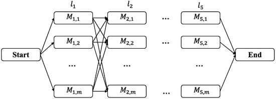 The set of machinable machines for a process i is denoted as Mi, where, for example, the set of all machinable machines for the first process is M1. For the i process, the j machinable machine is denoted by Mi,j. For instance, if there are three selectable machines on the first process, the set of selectable machines on the first process is {M1,1, M1,2, M1,3}.