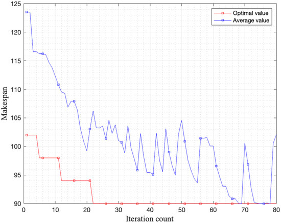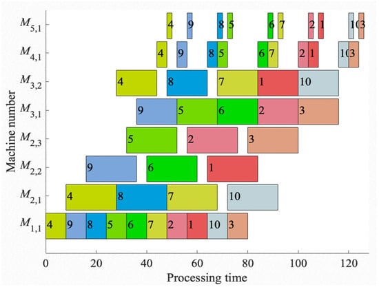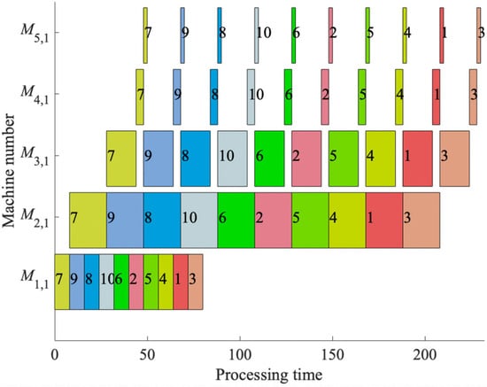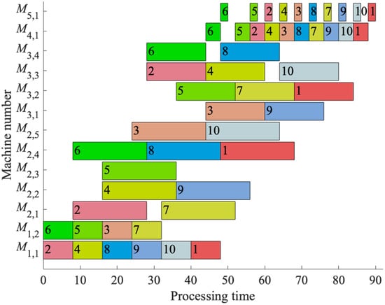 The makespan is not only linked to the production response speed, but it also indirectly reflects the throughput rate of the production flow. Lowering the makespan signifies the rapid completion of production tasks, impacting the business’s responsiveness and adaptability in the marketplace. In scheduling optimization, the choice of makespan as the objective is particularly relevant, since it directly reflects the efficiency of the production process and aids in diminishing the overall operational costs [64]. Therefore, this research focuses on minimizing the makespan, concentrating efforts on the optimization of a singular metric, thus laying a solid foundation for subsequent discussions and conclusions, ensuring the practicality and effectiveness of the proposed algorithm.
