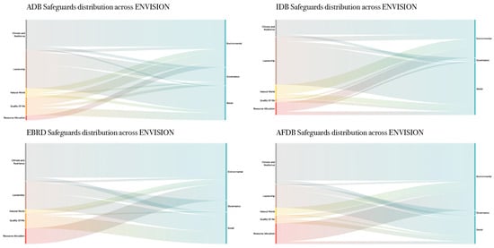 Sankey charts with distribution of ENVISION credits in thematic areas of safeguards according to qualitative analysis.