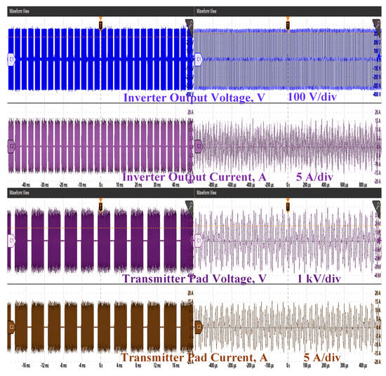 PDM pulses drive the receiver-side ABR, which regulates output power. Pout can be adjusted following (16) by varying d. The five-legged inverter excites the transmitters based on the position of the receiver. The receiver pad moves down the track as the control pulses of the inverter shift the legs. Legs 1 and 2 energize TP1, while Legs 2 and 3 energize TP2. To minimize the impact of transients, the least dead time is permitted while shifting the inverter legs. Experimental analysis curves of the proposed charging system are represented in Figure 19, Figure 20, Figure 21, Figure 22 and Figure 23. Figure 19 and Figure 20 represent the PDM-regulated ABR-controlled LCC–LCC and LCC–SP compensated charging system. The density of the pulses is adjusted to 80%, and the corresponding characteristics curves across the various elements of the system are observed. The average power, Pavg, delivered to the system is varied with respect to the relationship between Pavg, Prated, and d, which is described in (16). The receiver-side hybrid resonant network ensures the delivery of constant voltage and current concerning the status of the charging device. If the charging device voltage, Vbat, is lower than the reference voltage, Vref, the auxiliary switch opens, and the LCC network delivers the constant current independent of load variations. Once Vbat exceeds Vref, the switch closes, and LcR short circuits. The SP network delivers the constant voltage to the charging device. Figure 23 represents the charging systems’ constant current and voltage delivery independent of the load variations. Figure 21 and Figure 22 represent the experimental waveforms of the charging system during operating mode transition. The maximum charging system efficiency is 93.4%.