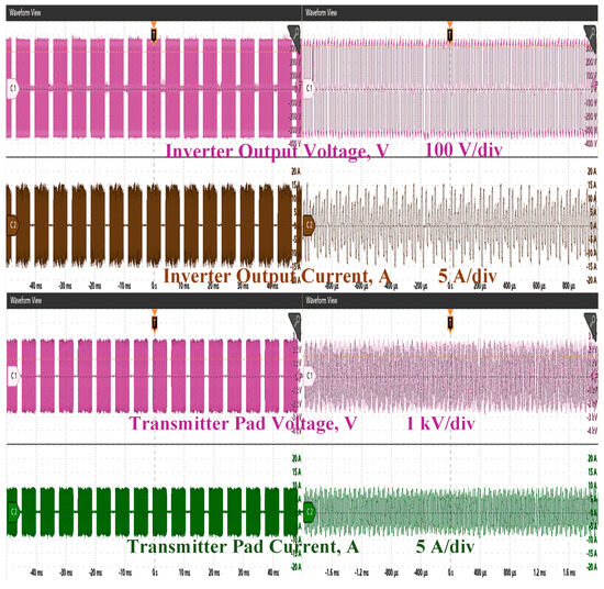 An experimental setup of the developed charging system is represented in Figure 24. The power is transferred by a 700 mm × 350 mm DD pad, and the charging pad has a 38 SWG Litz wire, a 9 mm thick ferrite core, and 2 mm of aluminum shielding. The charging coupler is excited by a 3.3 kW, 350 V, SiC-integrated five-legged inverter. The transmitter-side LCC network circulates the constant current in a transmitter pad, which is beneficial to the dynamic wireless charging system. The ferrite-cored inductor ensures the constant current in the charging coupler. The receiver-side hybrid compensation LCC–SP topology ensures constant charging. The SiC-integrated receiver-side bridge rectifier regulates the power delivered to the charging device by varying the density of the pulses. The FPGA controller delivers the controlling pulses to the transmitter- and receiver-side converter, and the system can perform constant charging and output power regulation. Table 1 illustrates the existing receiver-side controlled charging topology and parameters of the proposed topology.