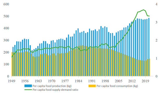 The realm of food security, marked by inherent complexity and dynamism, is influenced by a confluence of factors, including global pandemics, geopolitical strife, and climatic volatility, which have introduced challenges on an unprecedented scale [5,6]. In China, significant advances have been achieved in food production, supply chains, and agricultural economic development. Notably, China currently supports 22% of the global populace whilst possessing only 7% of the planet’s arable land [7]. For fourteen consecutive years, China’s per capita food availability has exceeded the globally recognized safety threshold of 400 kg per year, marking a crucial milestone in achieving grain self-sufficiency and the absolute security of staple foods. Despite these advances, a substantial demographic base continues to drive significant food demand, further intensified through the processes of urbanization and rapid economic growth, thereby increasing food requirements across both urban and rural sectors. Enhancements in urban–rural dynamics have facilitated resource distribution; however, disparities in resource allocation continue to pose risks to food security. The promotion of urban–rural integration strategies aims to optimize resource allocation efficiency, thereby reinforcing food security paradigms. The advances in agricultural technology have significantly increased food production levels; however, challenges such as land scarcity, workforce attrition, and an aging demographic persist [8,9]. Ensuring a stable and sufficient food supply remains critical [10]. Addressing the basic nutritional needs of the population will underpin food security. The historical data from the years 1949 to 2021 demonstrate the effective maintenance of per capita food consumption for urban and rural residents, with the food supply–demand ratio rising from 1.05 in 1949 to 3.68. As shown in Figure 1, as the trajectory of per capita food production approaches its peak, showing only a marginal decline, and with the diversification of the food supply leading to a reduction in per capita food demand, China is compelled to recalibrate its food security strategy to address the emerging challenges and shifts in paradigms.
