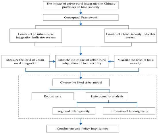 The interplay and evolution of urban and rural areas are fundamentally connected to national food security, significantly affecting the well-being of millions. Urban–rural integration is crucial for both optimal resource distribution and as a strategic method to secure food safety and promote sustainable agricultural growth. Facing the limitations and uniqueness of resources, an in-depth exploration of the dynamic relationship between urban–rural integration and food security is critical. This research endeavors to bridge the gaps in current studies and offer a scientific foundation for policy formulation through the analysis of comprehensive panel data from 31 provinces in China, excluding Hong Kong, Macau, and Taiwan. To clarify the relationship between urban–rural integration and food security, this study constructs a methodological flowchart, as illustrated in Figure 2.