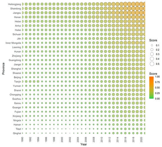 Figure 3 illustrates the levels of food security across China’s 31 provinces (excluding Hong Kong, Macau, and Taiwan) from 1990 to 2021, highlighting a consistent enhancement in food security across the provinces. Key grain-producing regions such as Heilongjiang, Henan, and Shandong remain pivotal in ensuring food security despite approaching saturation in their capacity. Leveraging their abundant resources, these primary production areas have efficiently supplied food to major consumption centers, fostering a synergy of regional strengths. Concurrently with economic progress, the focal point of food security is gradually shifting northward, with Xinjiang, Shanxi, and Qinghai emerging as critical hubs for food reserve capabilities, demonstrating significant potential. Although primary consumption areas display low self-sufficiency, their economic influence and robust infrastructure support reliance on primary production regions and trade to ensure food security. Advancements in transportation, technology, and digitalization are steadily enhancing food supply capabilities, underscoring the importance of maintaining regional food security equilibrium as a fundamental aspect of revising the national food security strategy.