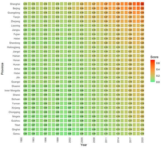 Figure 4 illustrates the levels of urban–rural integration across China’s 31 provinces (excluding Hong Kong, Macau, and Taiwan) from 1990 to 2021, providing a clear visual representation. Analyzing the urban–rural integration data visually permits an intuitive understanding of the disparities in integration levels among provinces, highlighting significant variations. For instance, developed regions such as Beijing, Shanghai, Guangdong, Zhejiang, and Jiangsu consistently demonstrate high levels of urban–rural integration, reflecting their advanced economic development, comprehensive urbanization, and effective integration of urban and rural public services. In contrast, less developed areas such as Guangxi, Guizhou, Yunnan, Xinjiang, and Tibet present substantial opportunities for improving their urban–rural integration.