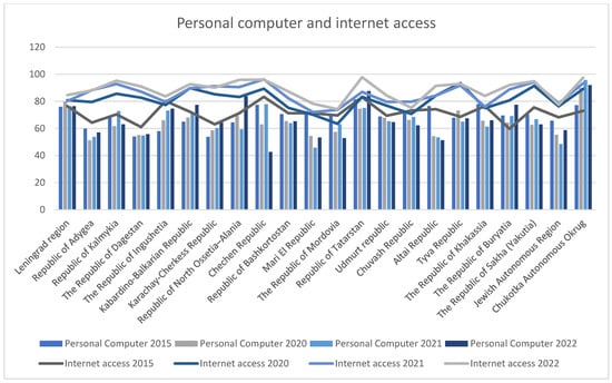 Figure 1 shows the proportion of people with personal computers and Internet access at home in the twenty-two regions. The results show that more people had Internet access than personal computers in most of the regions. We also found that for some regions, such as the Chechen Republic and the Republic of Mordovia, the share of people with personal computers reduced from 2015 to 2022, whereas for most regions, the share of people with Internet access increased.