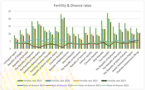 Figure 2 shows the rate of fertility and the rate of divorce in all twenty-two regions over the four observed years. The results show that the fertility rate, measured by the number of births per 1000 people, exceeded the rate of divorce in all regions. While the highest fertility rates were observed in the Chechen and Tyva Republics, the lowest divorce rates were observed in the Mordovia and Tyva Republics. Tyva Republic ranked among the highest for fertility and the lowest for divorces.